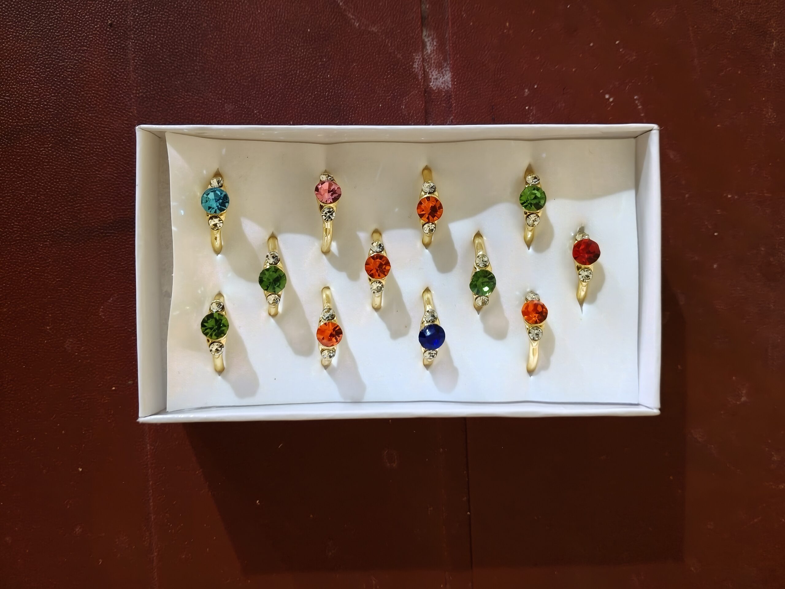 A premium set of 12 multicolour adjustable rings designed with a gold plated finish.